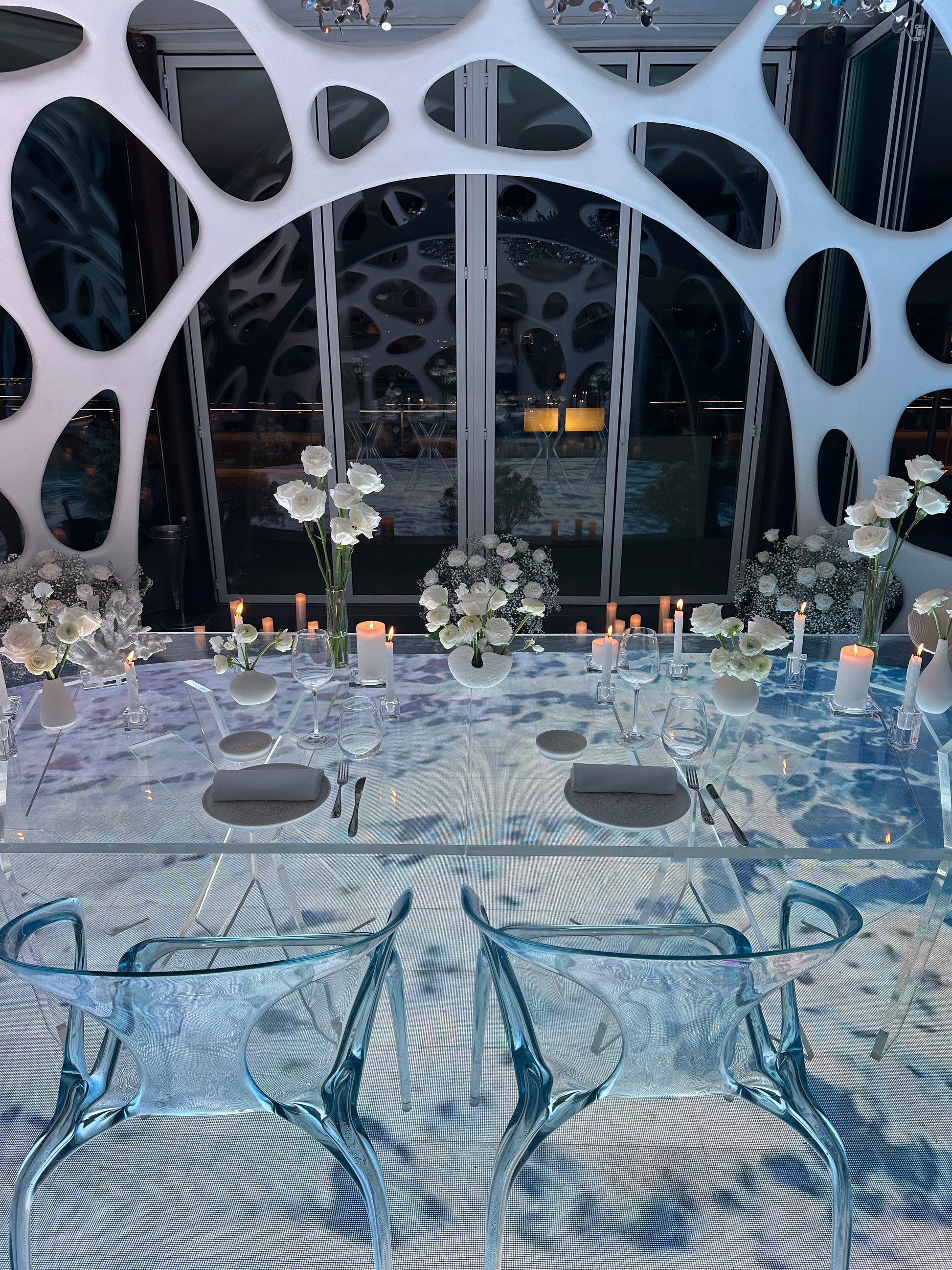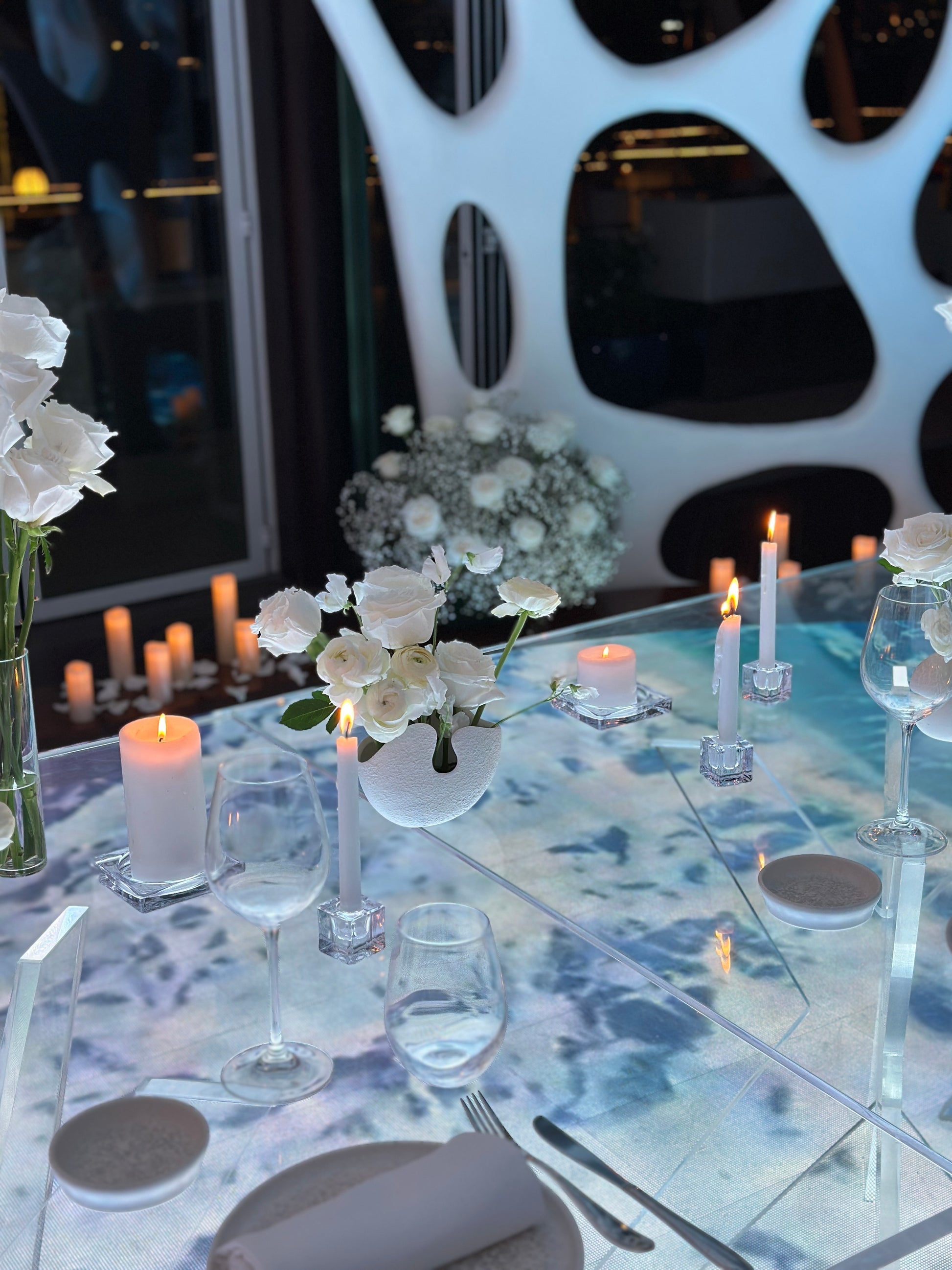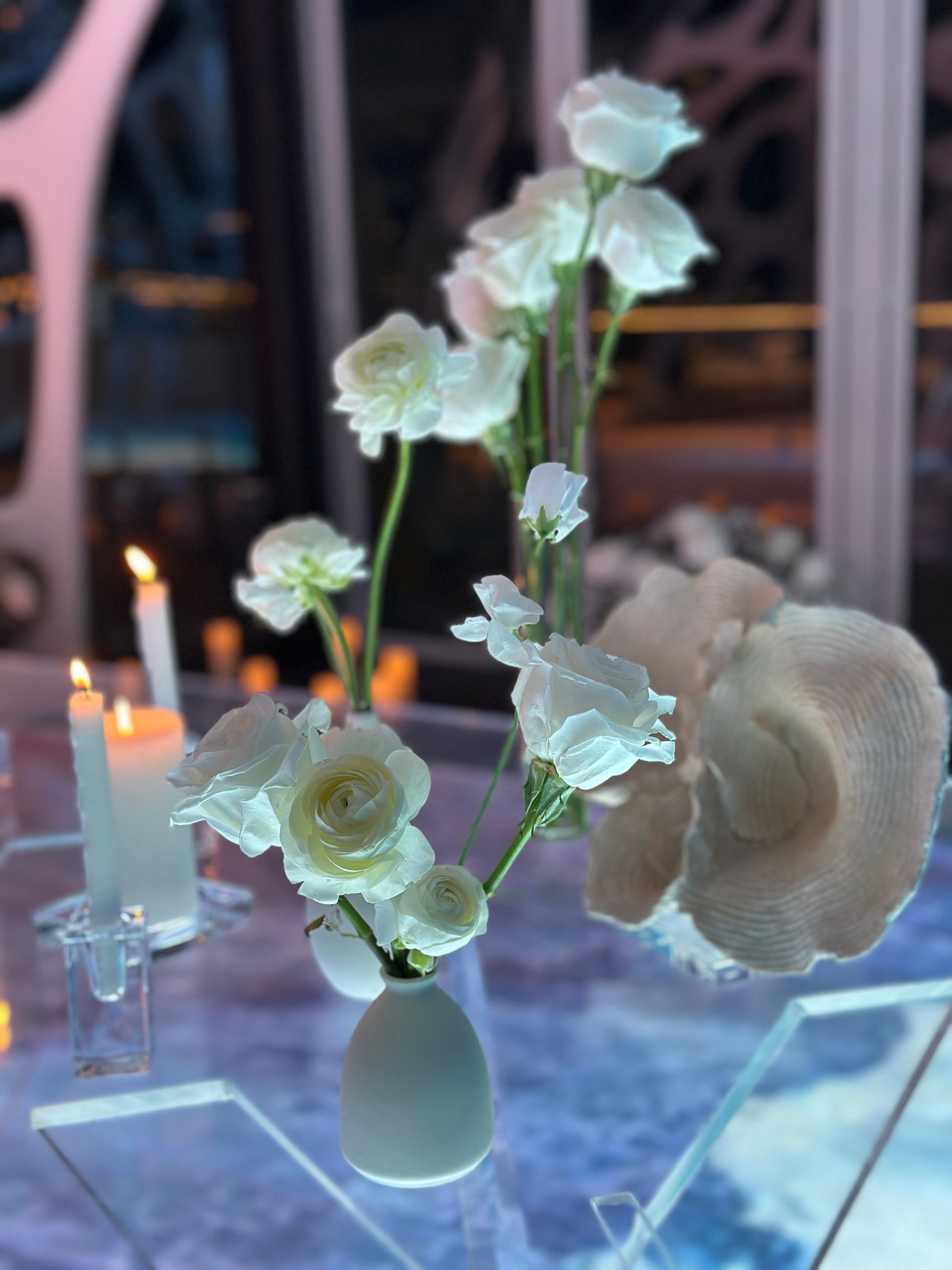 - Table decoration with candles , flowers in bud vases and ikebana